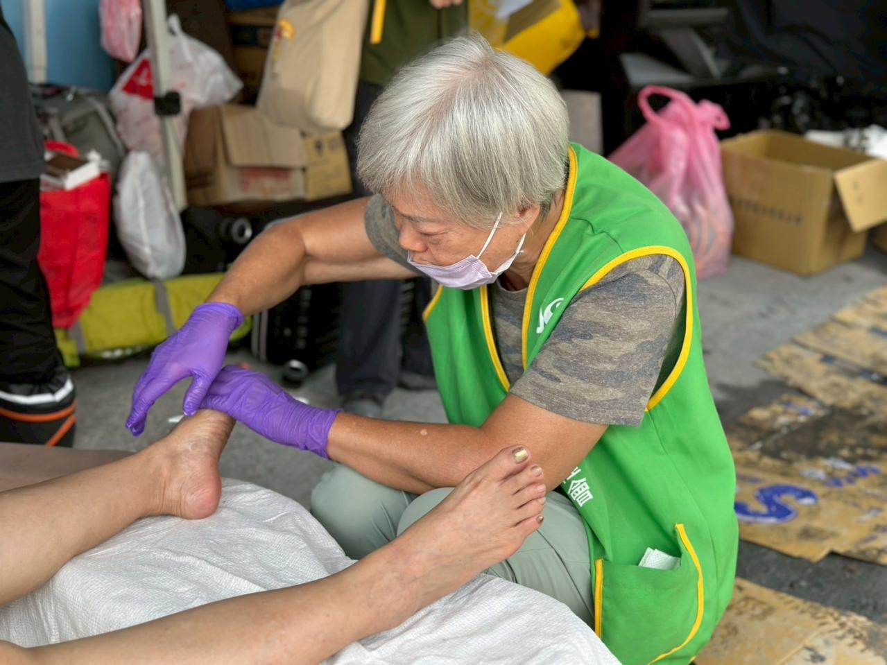 為紓解災民身心與志工服務壓力,芥菜種會「習得熟齡足療隊」前進災區服務。(基督教芥菜種會提供)