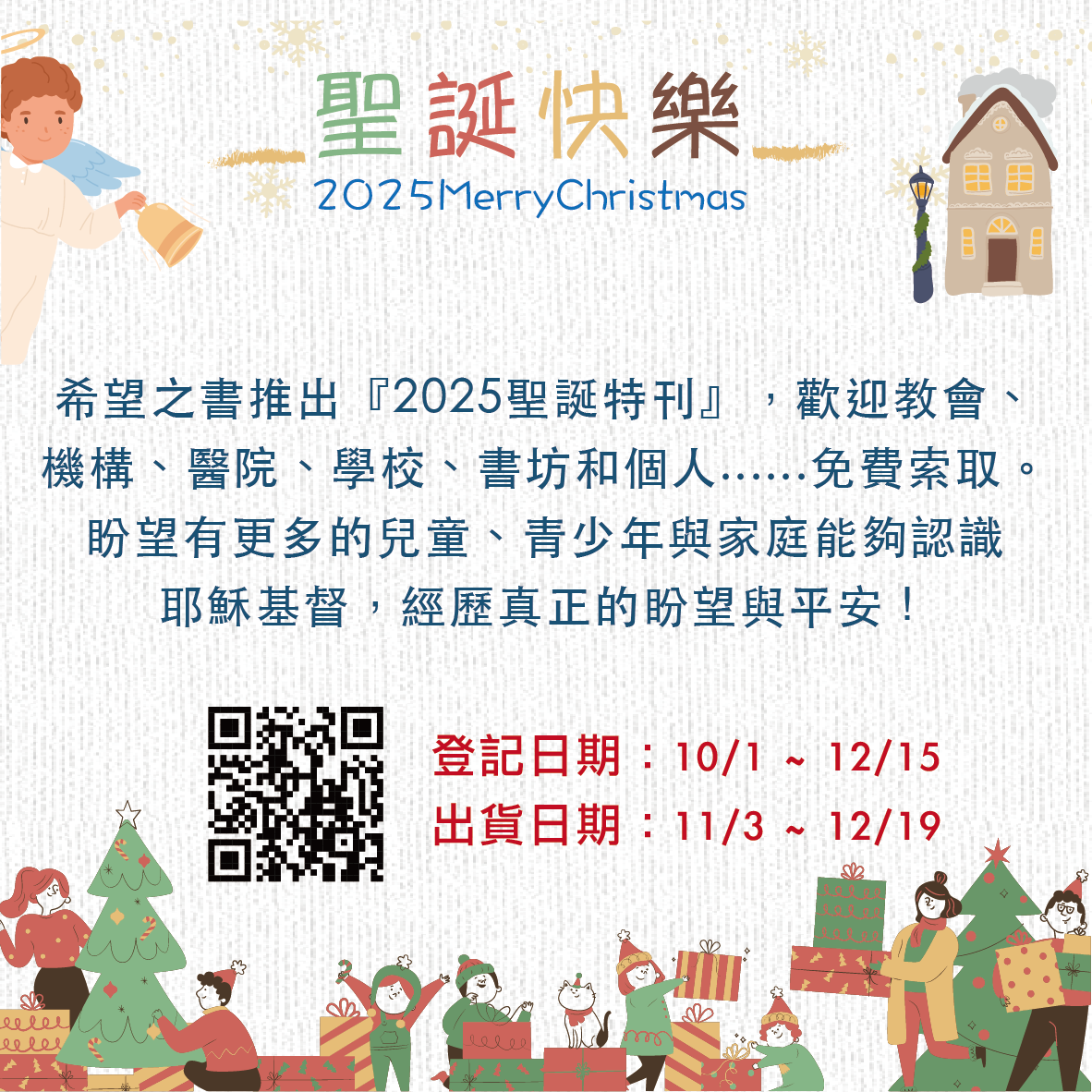 「這一刻,好想遇到一個能讓自己幸福的人!」希望之書今年在聖誕節前夕,推出0到100歲的《聖誕家庭包》,即日起至12月15日可免費申請索取,不論是各教會、機構、醫院、學校、書坊、職場及個人皆可索取。盼望每一位福音朋友在尋找愛與被愛的過程中,找到專屬自己一份的平安與喜樂,也願這一份聖誕特刊成為教會、機構福音前線的祝福。