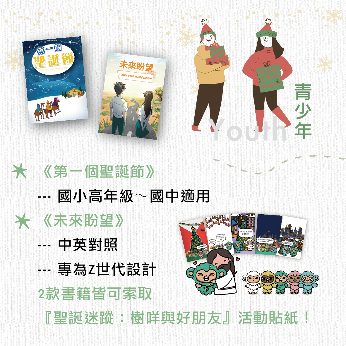 不僅如此,兒童今年預備了《超級妙妙書》內有注音版、封底附著色圖;《兒童聖經軟體希望之書》有中、英兩種版本,並可索取著色圖(4款隨機出貨);青少年版從國小高年級至國中皆適用,分別是《第一個聖誕節》、《未來盼望》中英對照與專為Z世代設計內容,兩款書皆可索取「聖誕迷蹤:樹咩與好朋友」活動貼紙。
