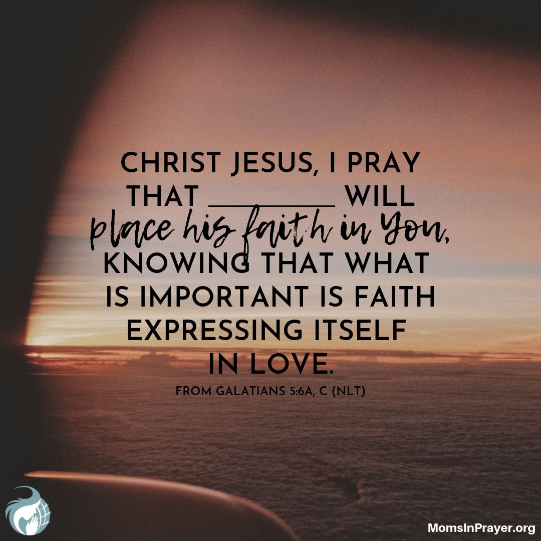 Christ Jesus, I pray that ________ will place his faith in You, knowing that what is important is faith expressing itself in love. From Galatians 5:6a, c (NLT)