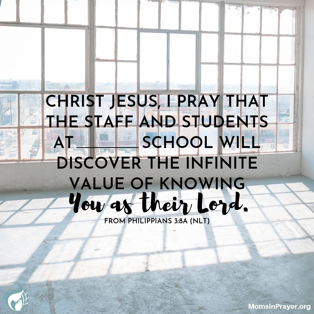 Christ Jesus, I pray that the staff and students at _______ school will discover the infinite value of knowing You as their Lord. From Philippians 3:8a (NLT)