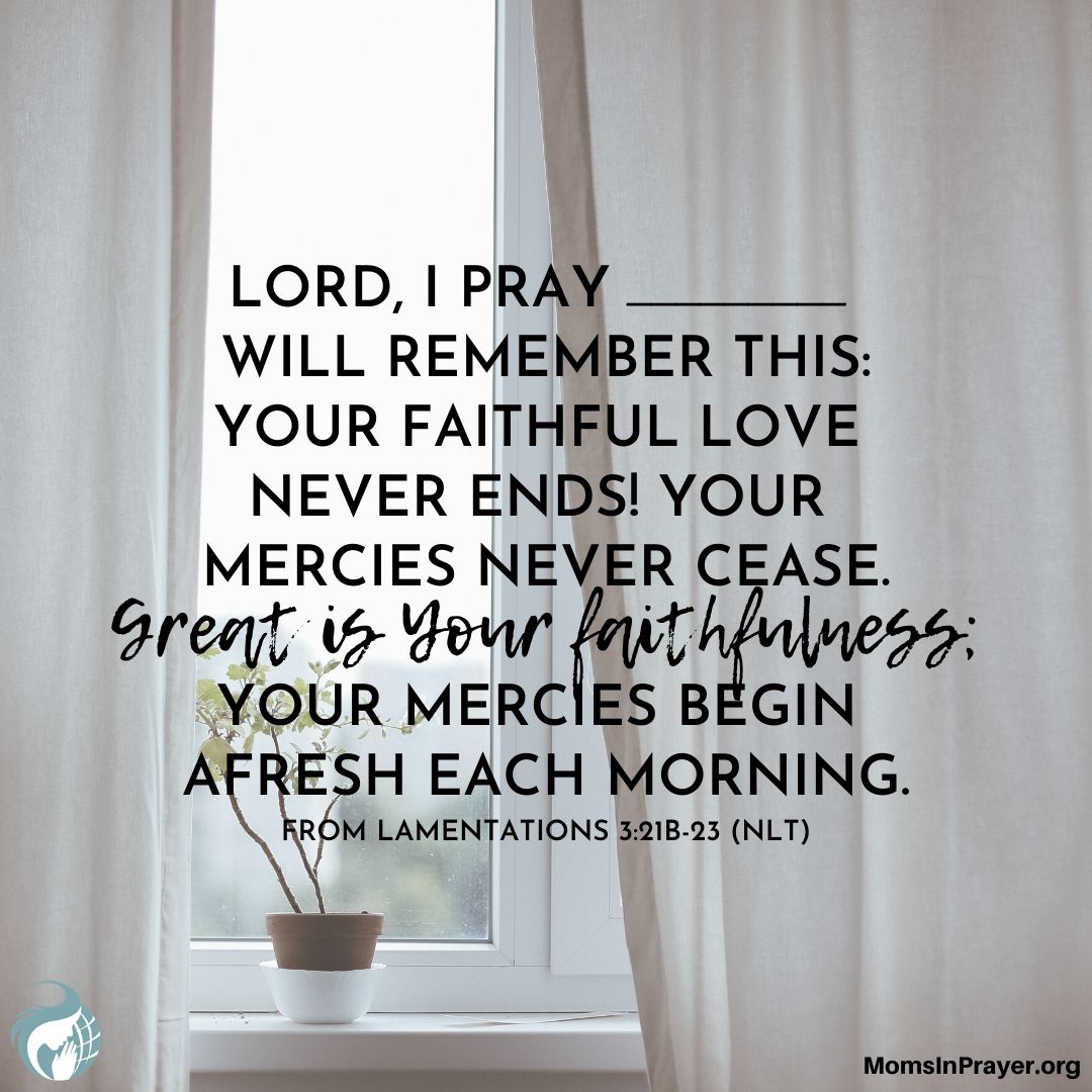 LORD, I pray ________ will remember this: Your faithful love never ends! Your mercies never cease. Great is Your faithfulness; Your mercies begin afresh each morning. From Lamentations 3:21b-23 (NLT)
