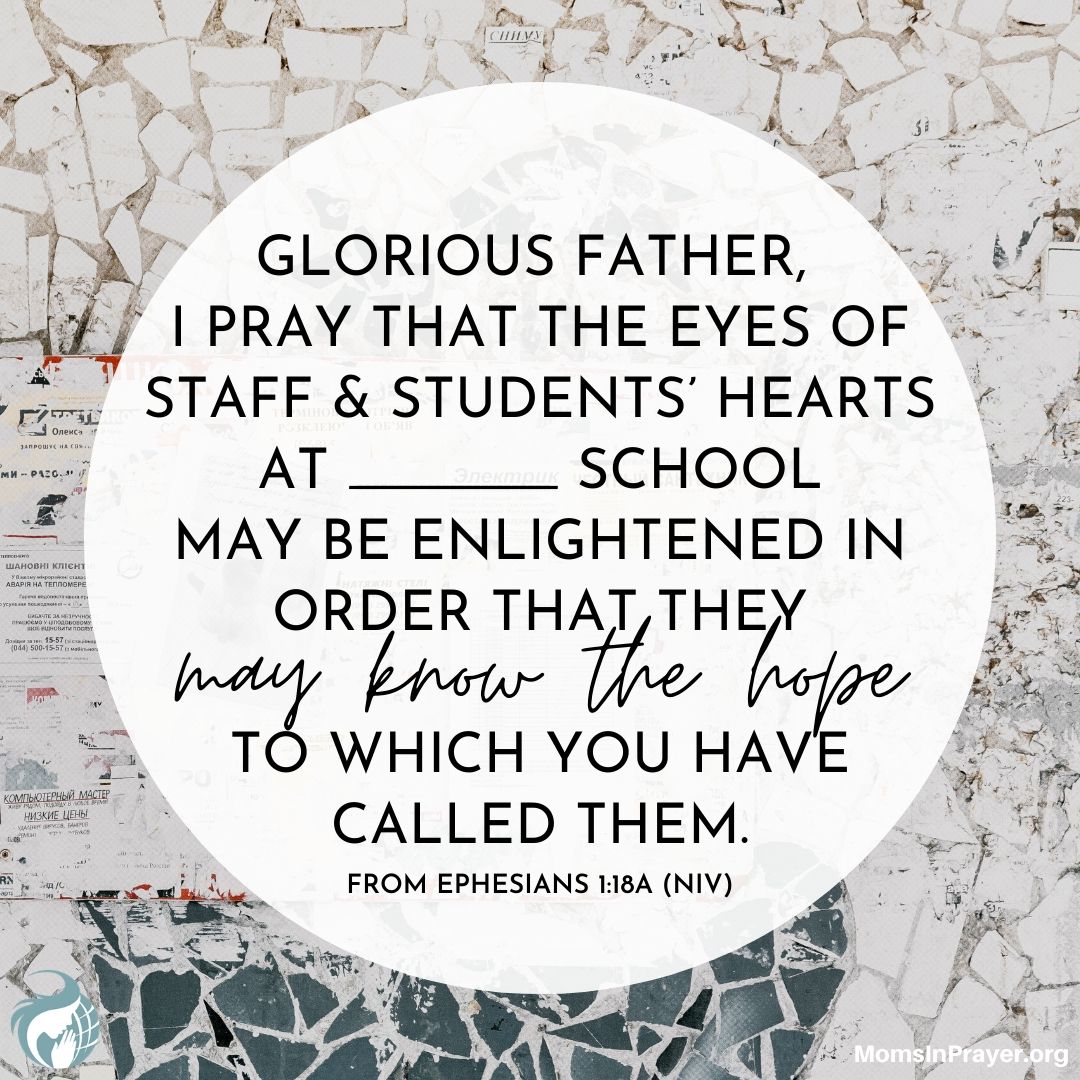 Glorious Father, I pray that the eyes of staff and students’ hearts at ______ school may be enlightened in order that they may know the hope to which You have called them. From Ephesians 1:18a (NIV)