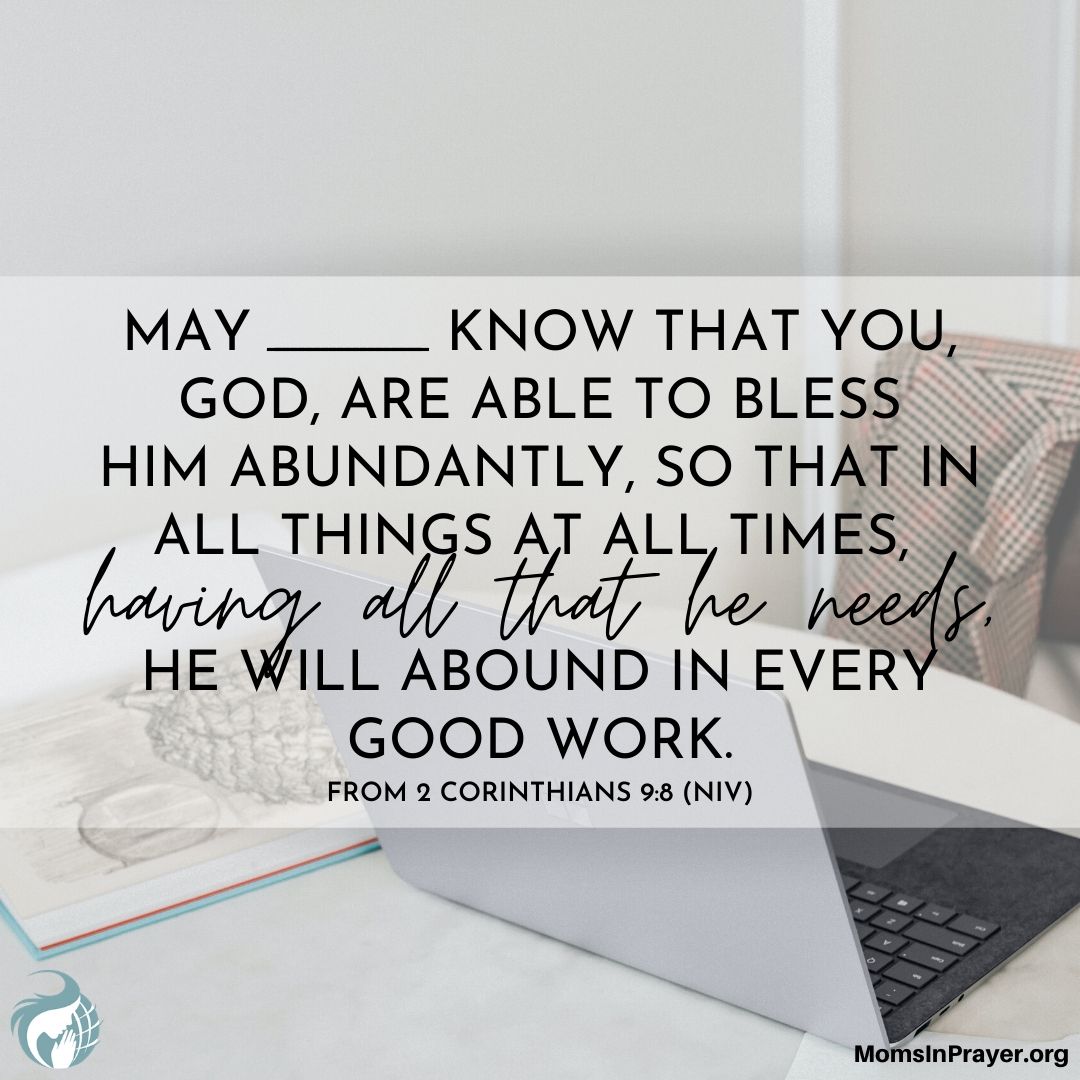 May _____ know that You, God, are able to bless him abundantly, so that in all things at all times, having all that he needs, he will abound in every good work. From 2 Corinthians 9:8(NIV)