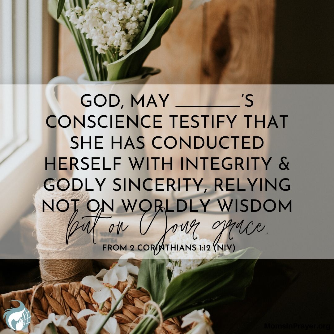 God, may ________’s conscience testify that she has conducted herself with integrity and godly sincerity, relying not on worldly wisdom but on Your grace. From 2 Corinthians 1:12 (NIV)