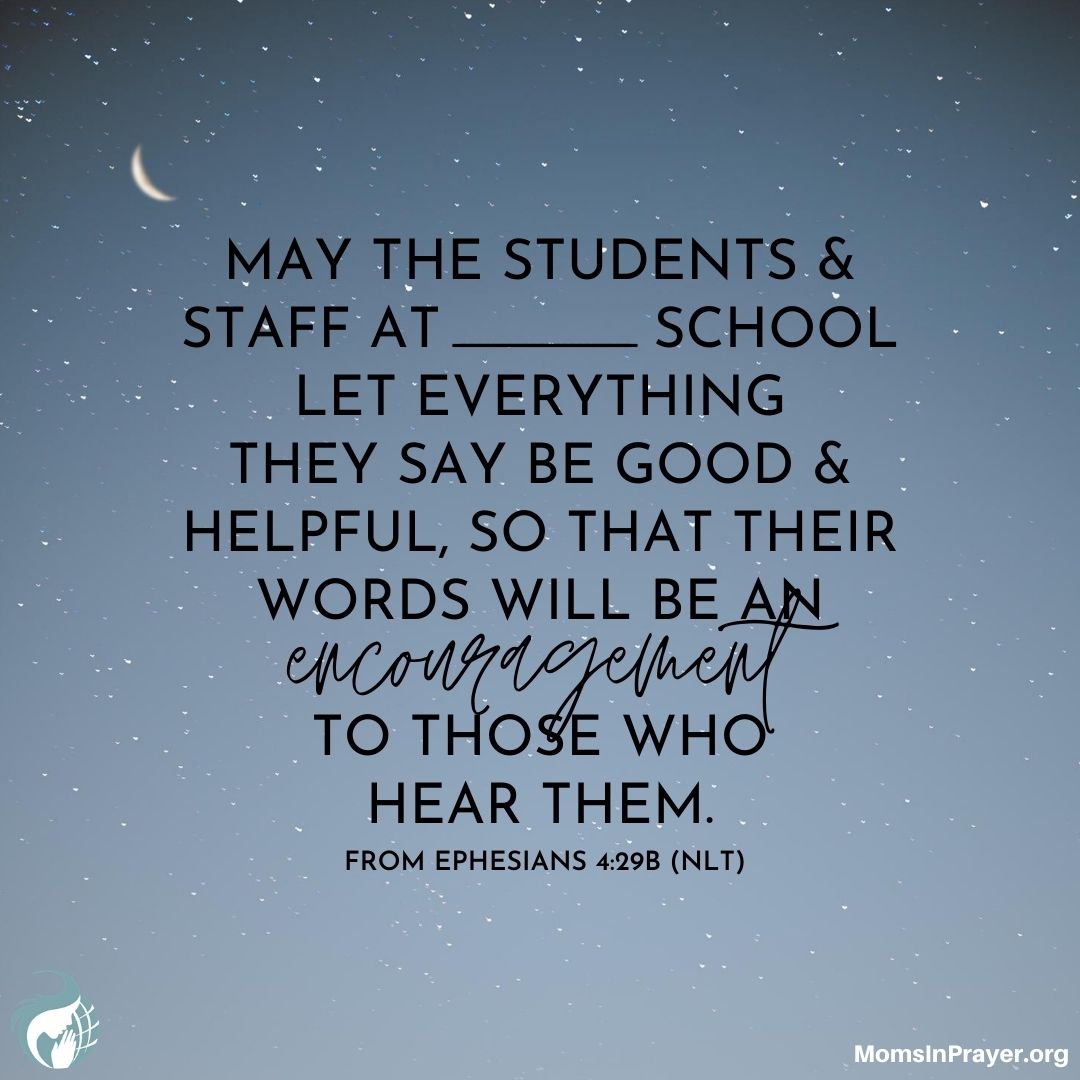 May the students and staff at _____ school let everything they say be good and helpful, so that their words will be an encouragement to those who hear them. From Ephesians 4:29b (NLT)