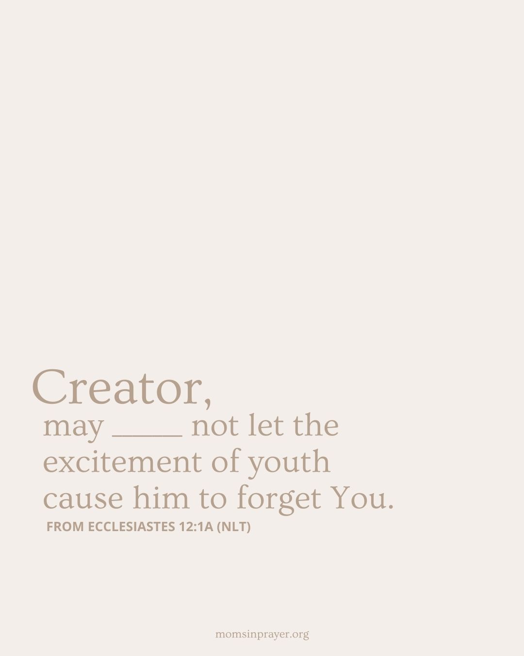 Creator, may ______ not let the excitement of youth cause him to forget You.