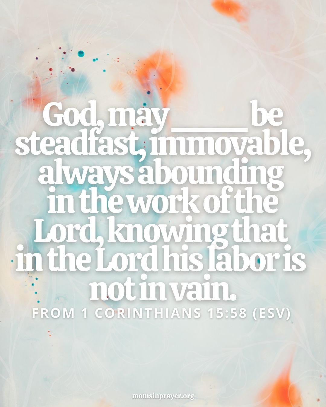 God, may _______ be steadfast, immovable, always abounding in the work of the Lord, knowing that in the Lord his labor is not in vain. From 1 Corinthians 15:58 (ESV)