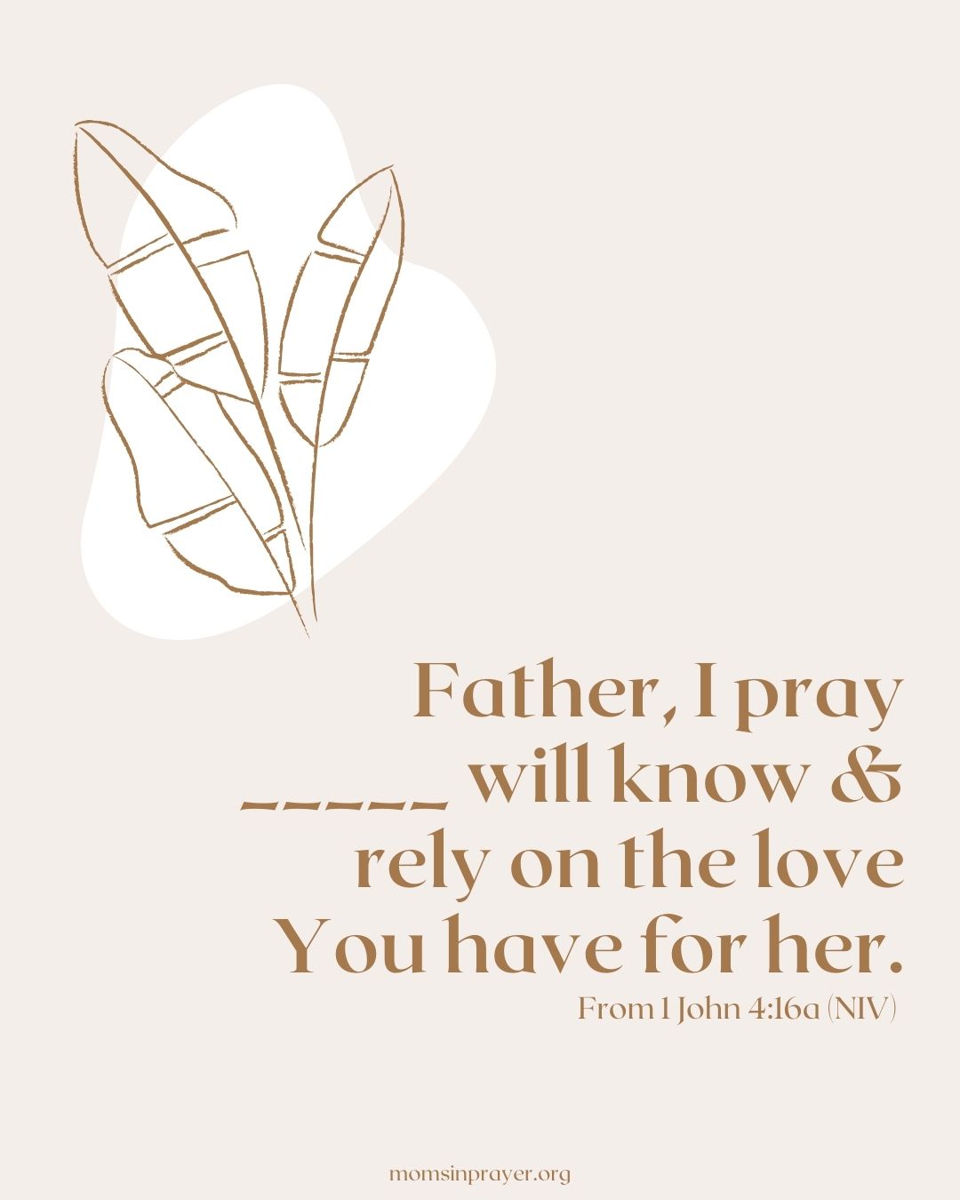 慈愛的天父,我祈求 ________ 能知道神就是愛,住在愛裡面的;就是住在神裡面,神也住在他/她裡面。