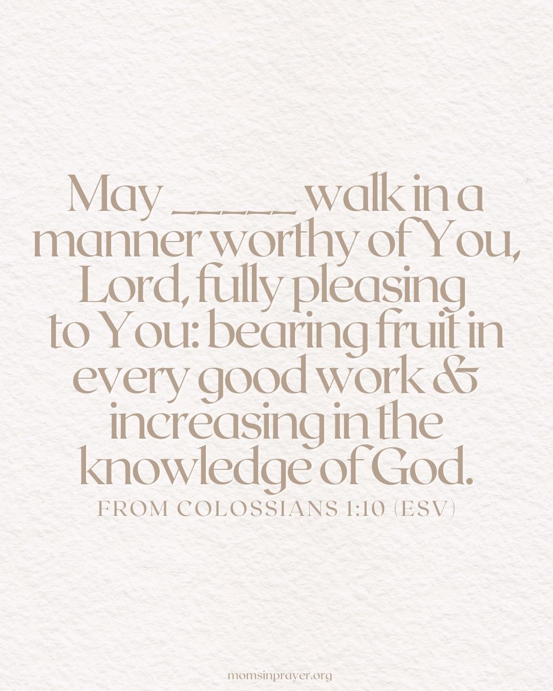 May ________ walk in a manner worthy of You, Lord, fully pleasing to You: bearing fruit in every good work and increasing in the knowledge of God. From Colossians 1:10 (ESV)