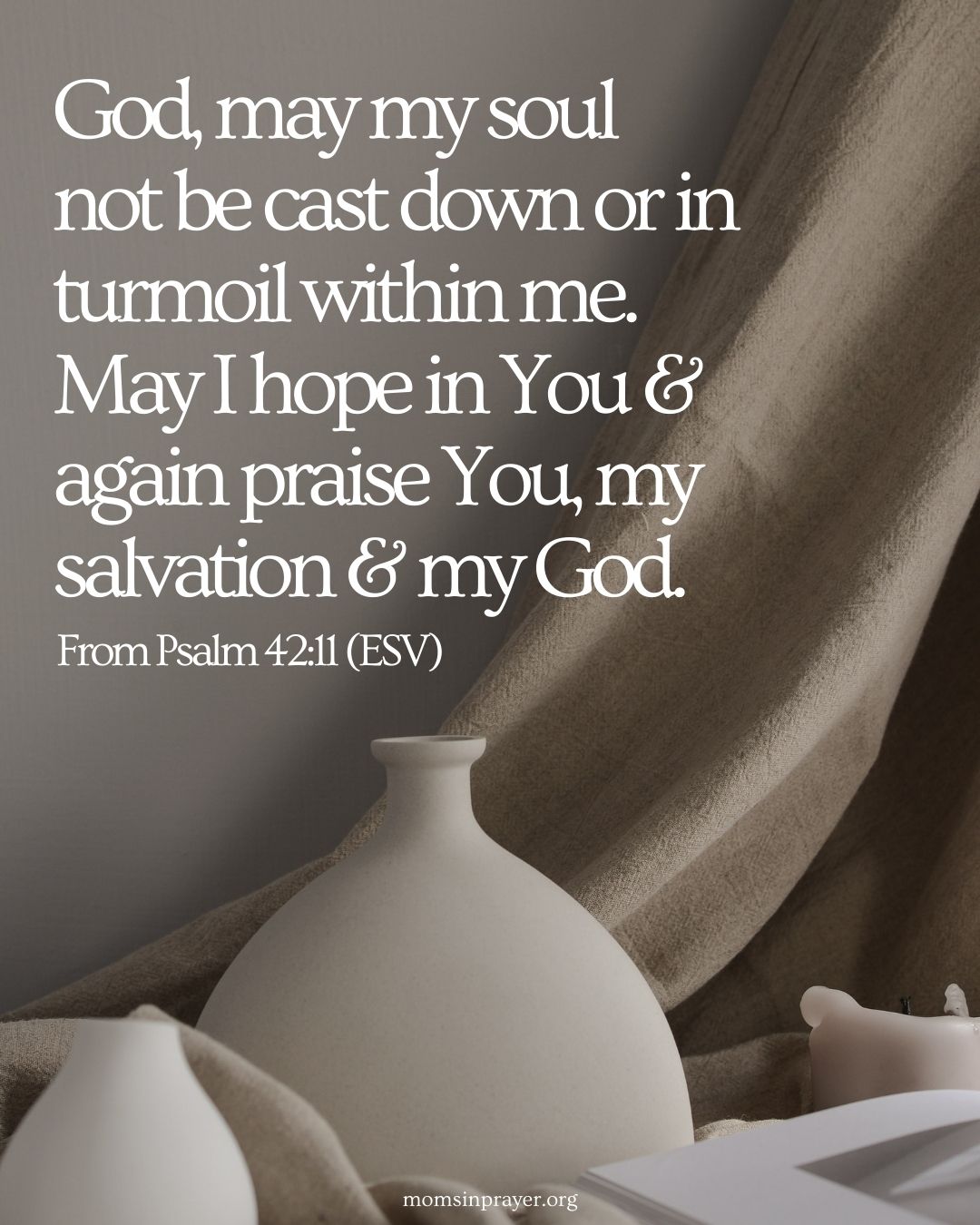 God, may my soul not be cast down or in turmoil within me. May I hope in You and again praise You, my salvation and my God.