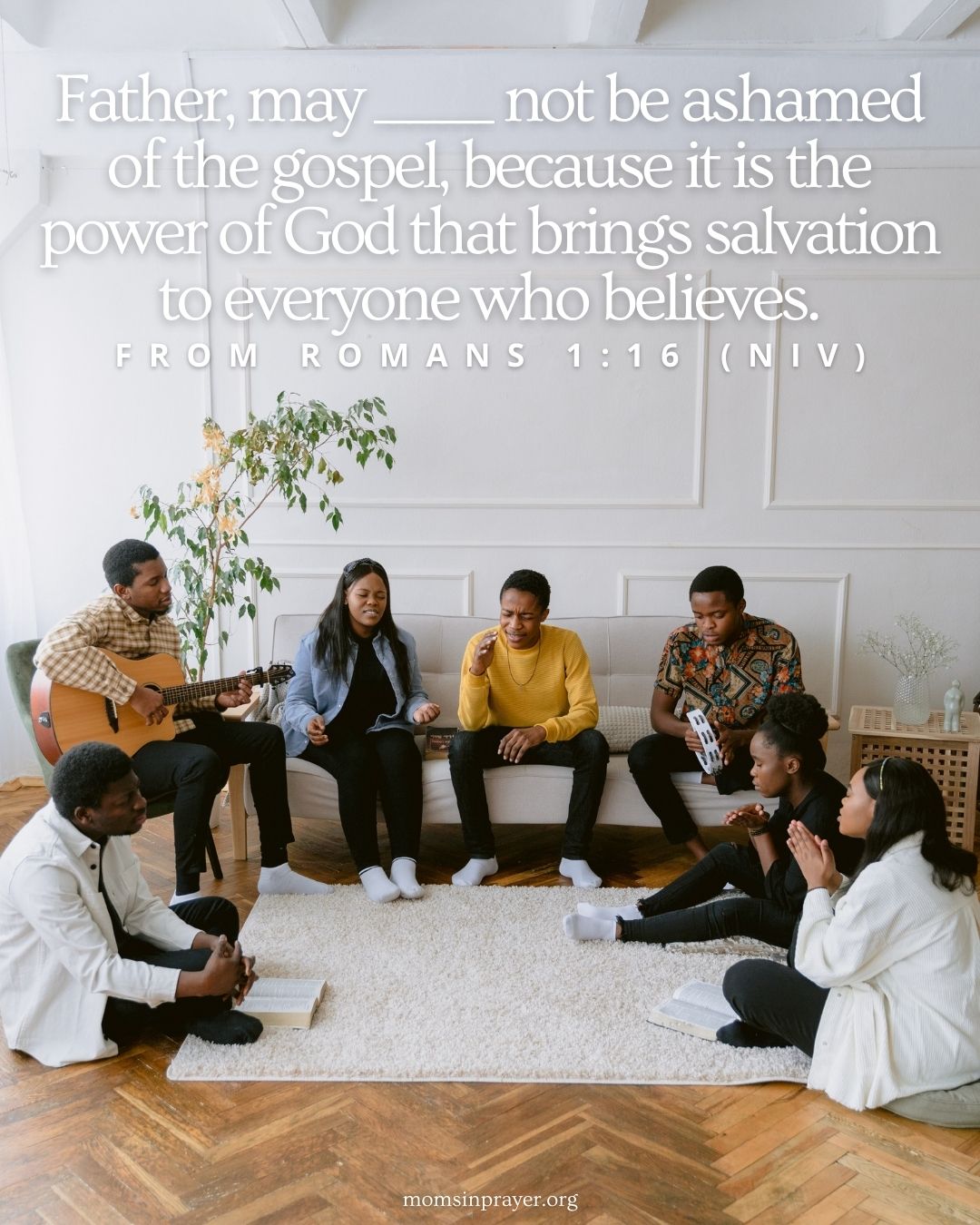 Father, may _______ not be ashamed of the gospel, because it is the power of God that brings salvation to everyone who believes. From Romans 1:16 (NIV)