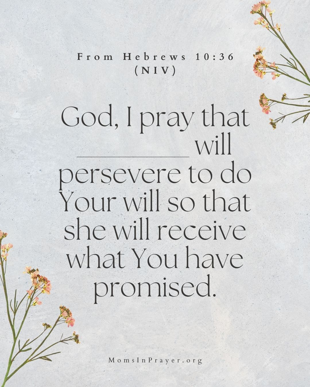 God, I pray that ________ will persevere to do Your will so that she will receive what You have