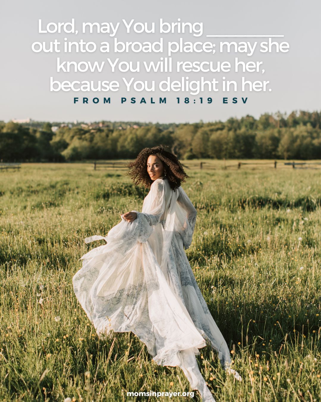 Lord, may You bring ________ out into a broad place; may she know You will rescue her, because You delight in her.