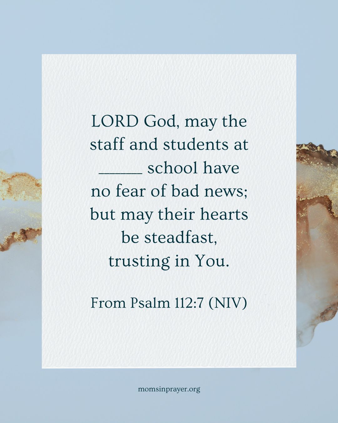 LORD God, may the staff and students at ________ school have no fear of bad news; but may their hearts be steadfast, trusting in You. From Psalm 112:7 (NIV)