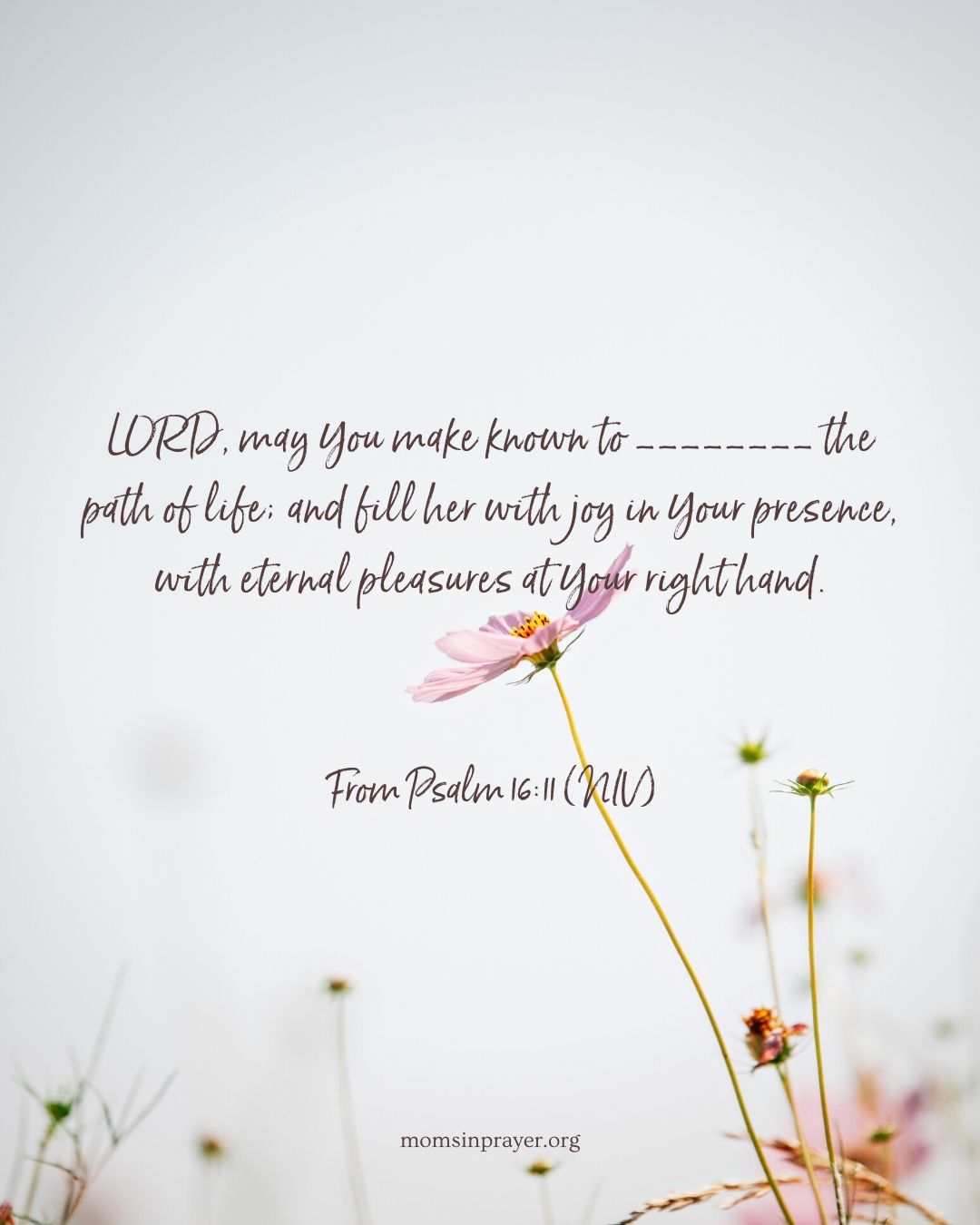 LORD, may You make known to ________ the path of life; and fill her with joy in Your presence, with eternal pleasures at Your right hand. From Psalm 16:11 (NIV)