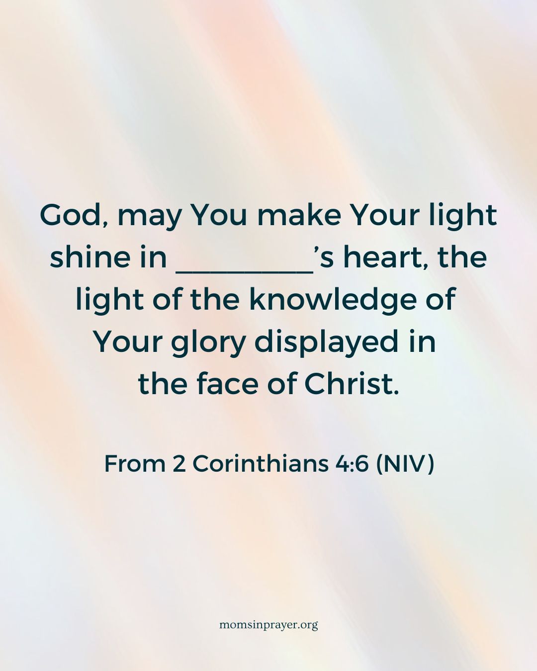 God, may You make Your light shine in ________’s heart, the light of the knowledge of Your glory displayed in the face of Christ. From 2 Corinthians 4:6 (NIV)