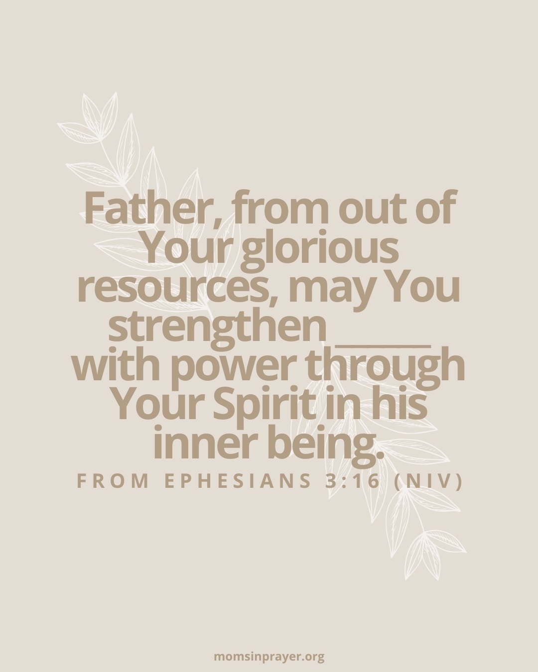 Father, from out of Your glorious resources, may You strengthen ______ with power through Your Spirit in his inner being.