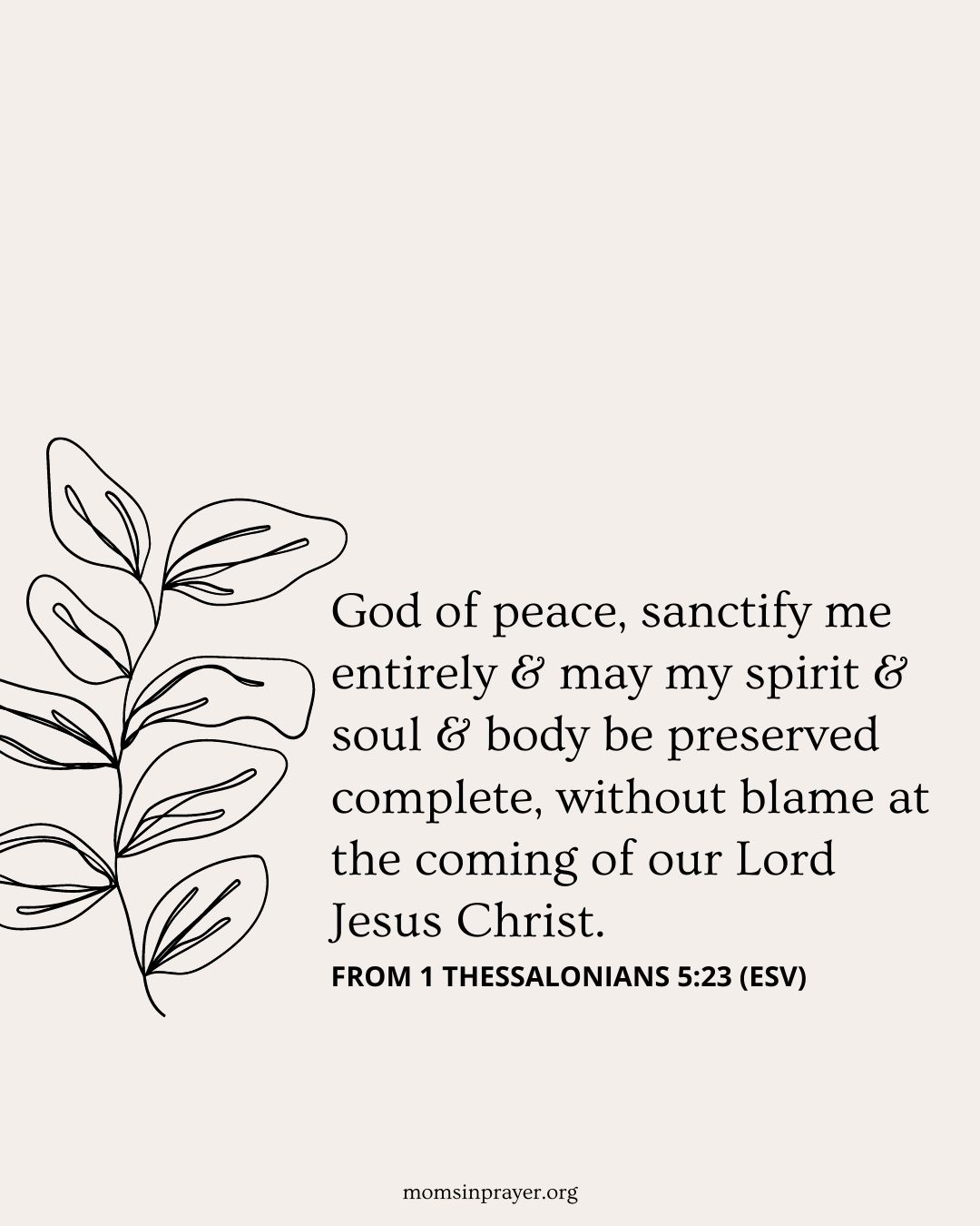 God of peace, sanctify me entirely and may my spirit and soul and body be preserved complete, without blame at the coming of our Lord Jesus Christ. From 1 Thessalonians 5:23 (ESV)
