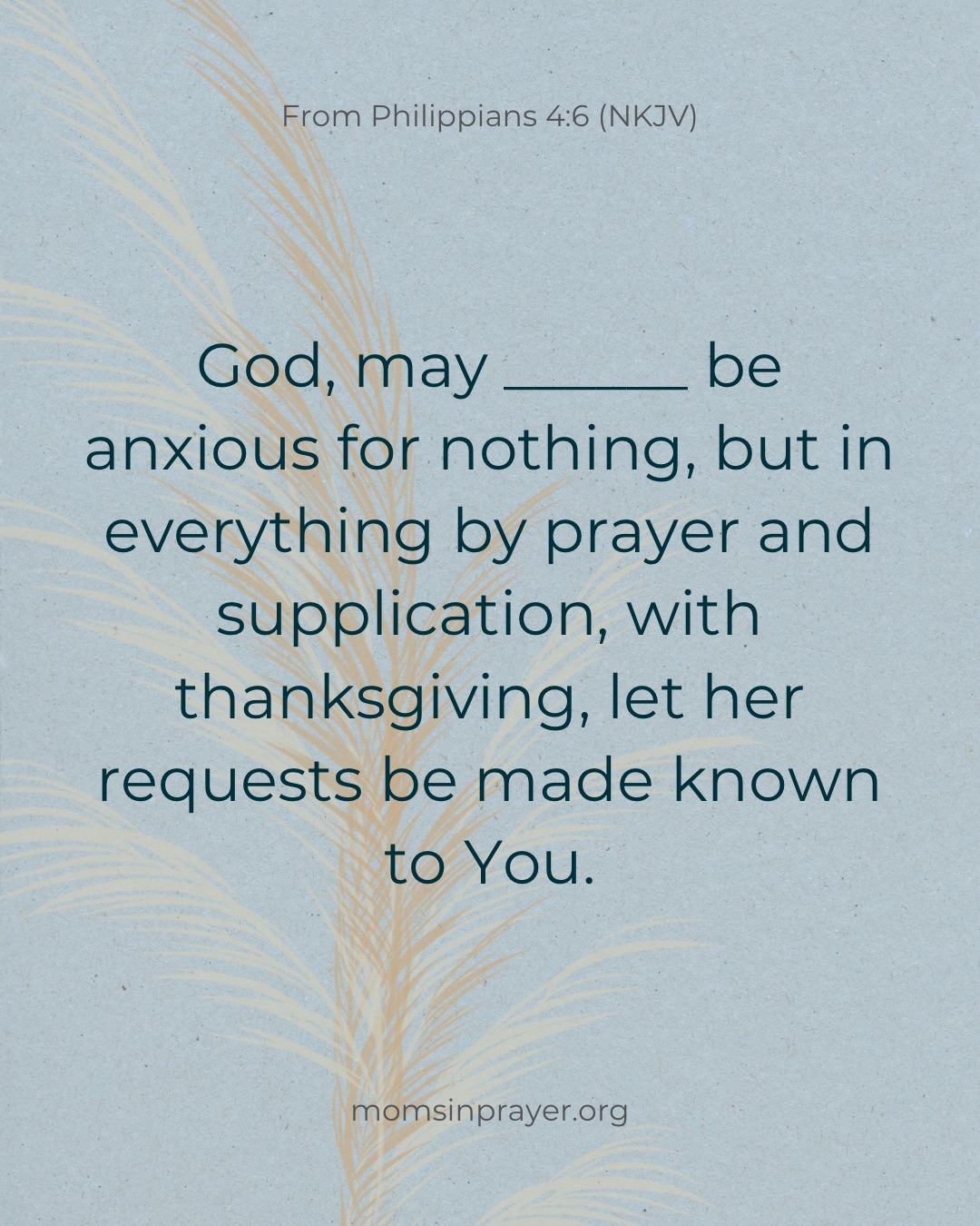 God, may ______ be anxious for nothing, but in everything by prayer and supplication, with thanksgiving, let her requests be made known to You. From Philippians 4:6 (NKJV)