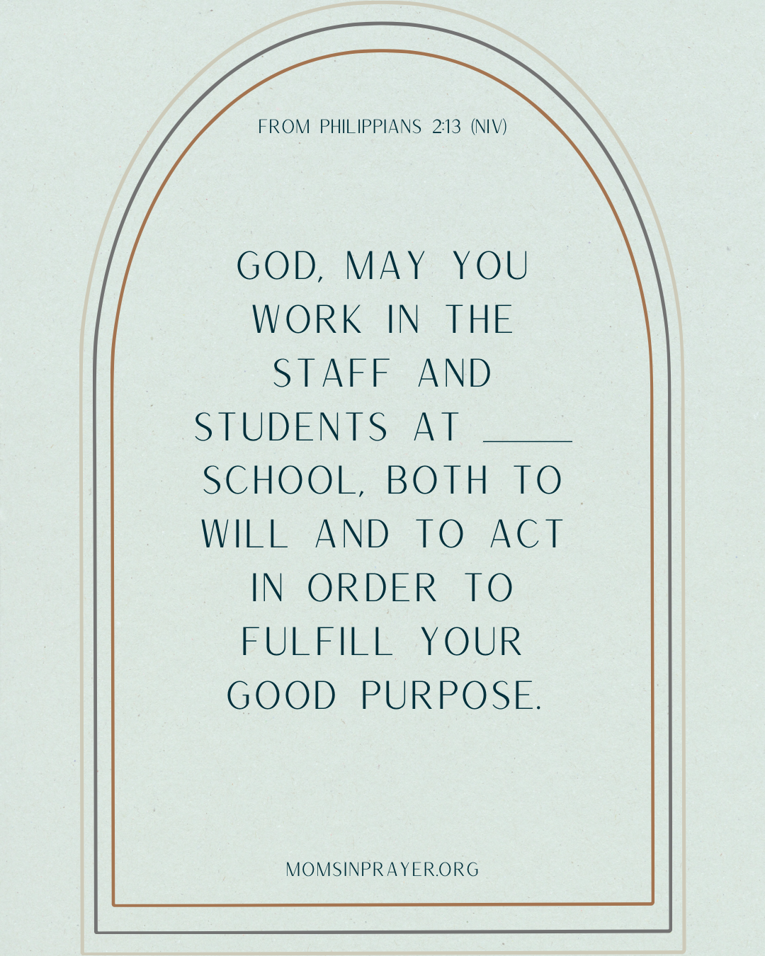 God, may You work in the staff and students at ______ school, both to will and to act in order to fulfill Your good purpose. From Philippians 2:13 (NIV)