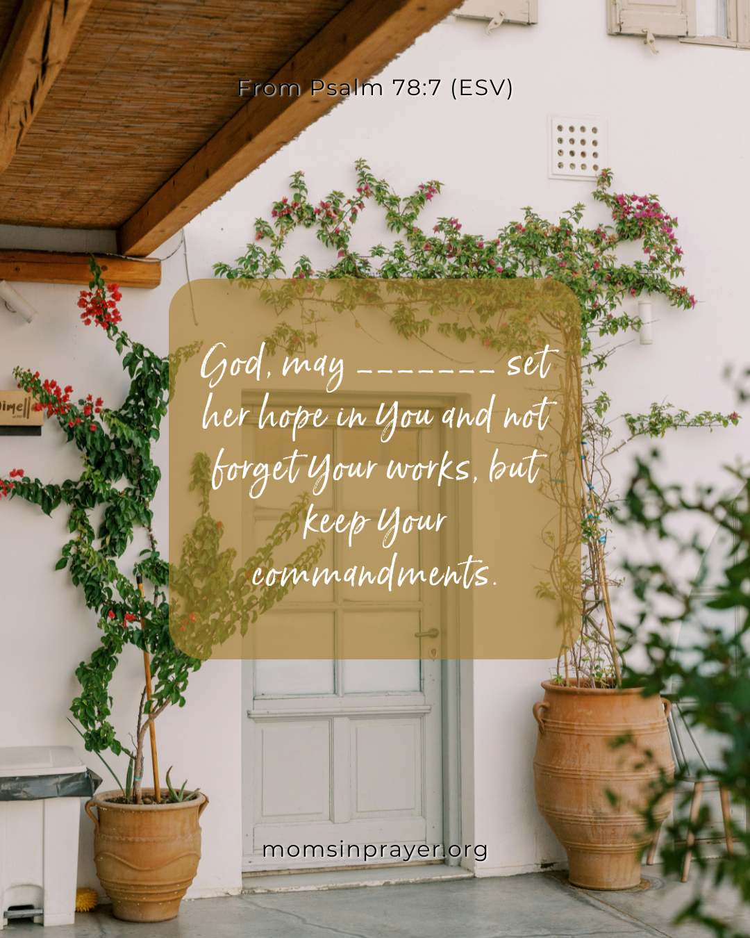 God, may _______ set her hope in You and not forget Your works, but keep Your commandments.