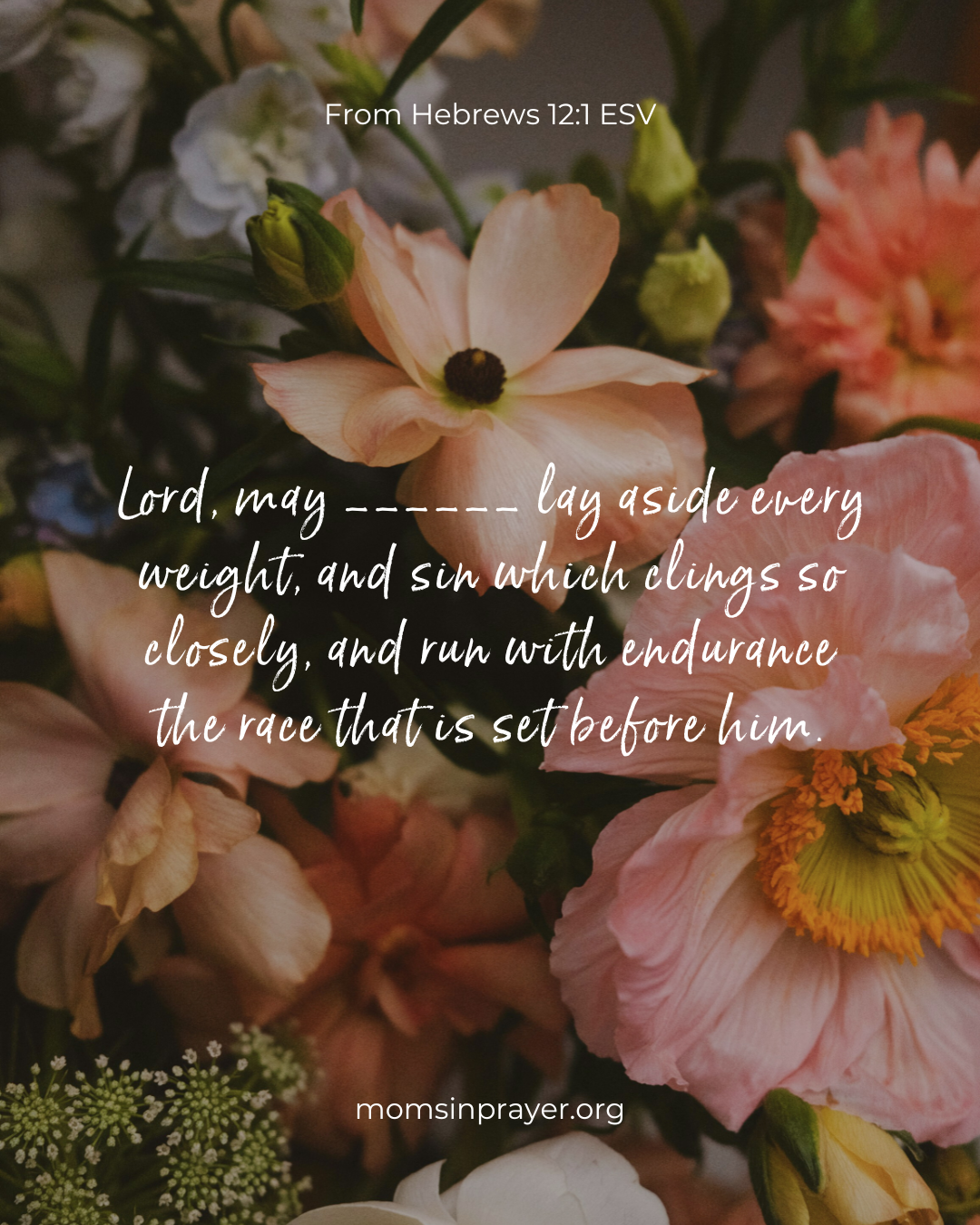 Lord, may ______ lay aside every weight, and sin which clings so closely, and run with endurance the race that is set before him. From Hebrews 12:1 ESV