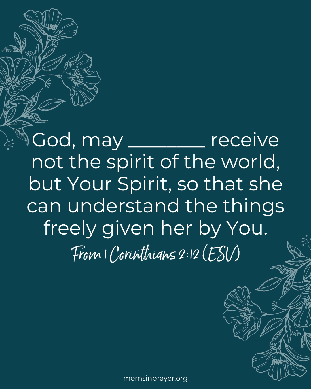 God, may ________ receive not the spirit of the world, but Your Spirit, so that she can understand the things freely given her by You. From 1 Corinthians 2:12 (ESV)