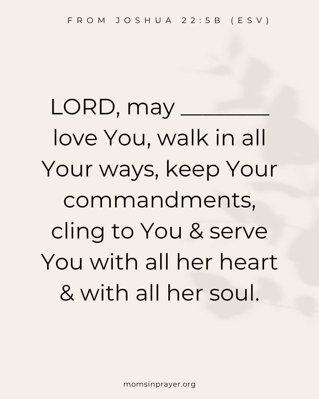 LORD, may ________ love You, walk in all Your ways, keep Your commandments, cling to You and serve You with all her heart and with all her soul. From Joshua 22:5b (ESV) Image from Canva.com