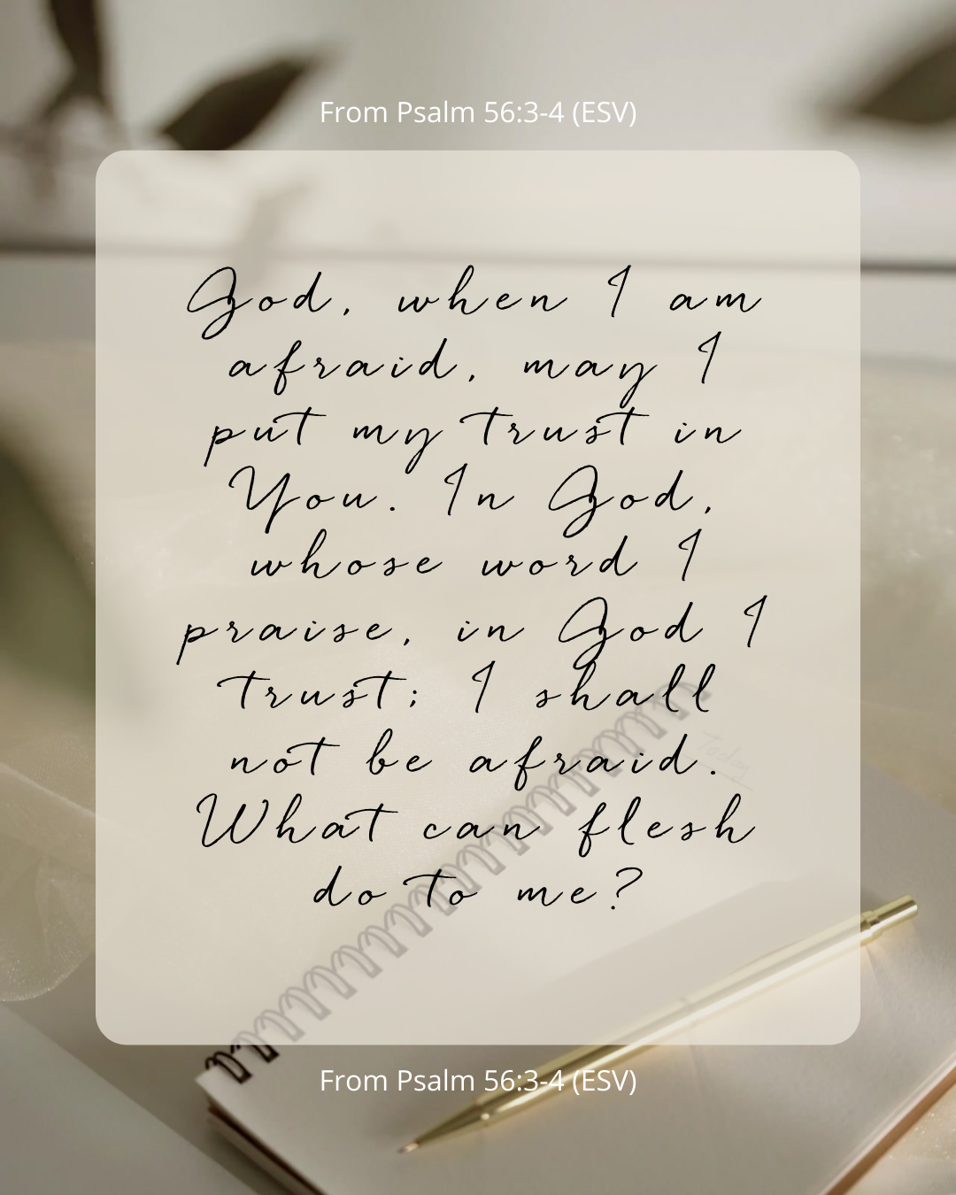 God, when I am afraid, may I put my trust in You. In God, whose word I praise, in God I trust; I shall not be afraid. What can flesh do to me? From Psalm 56:3-4 (ESV)