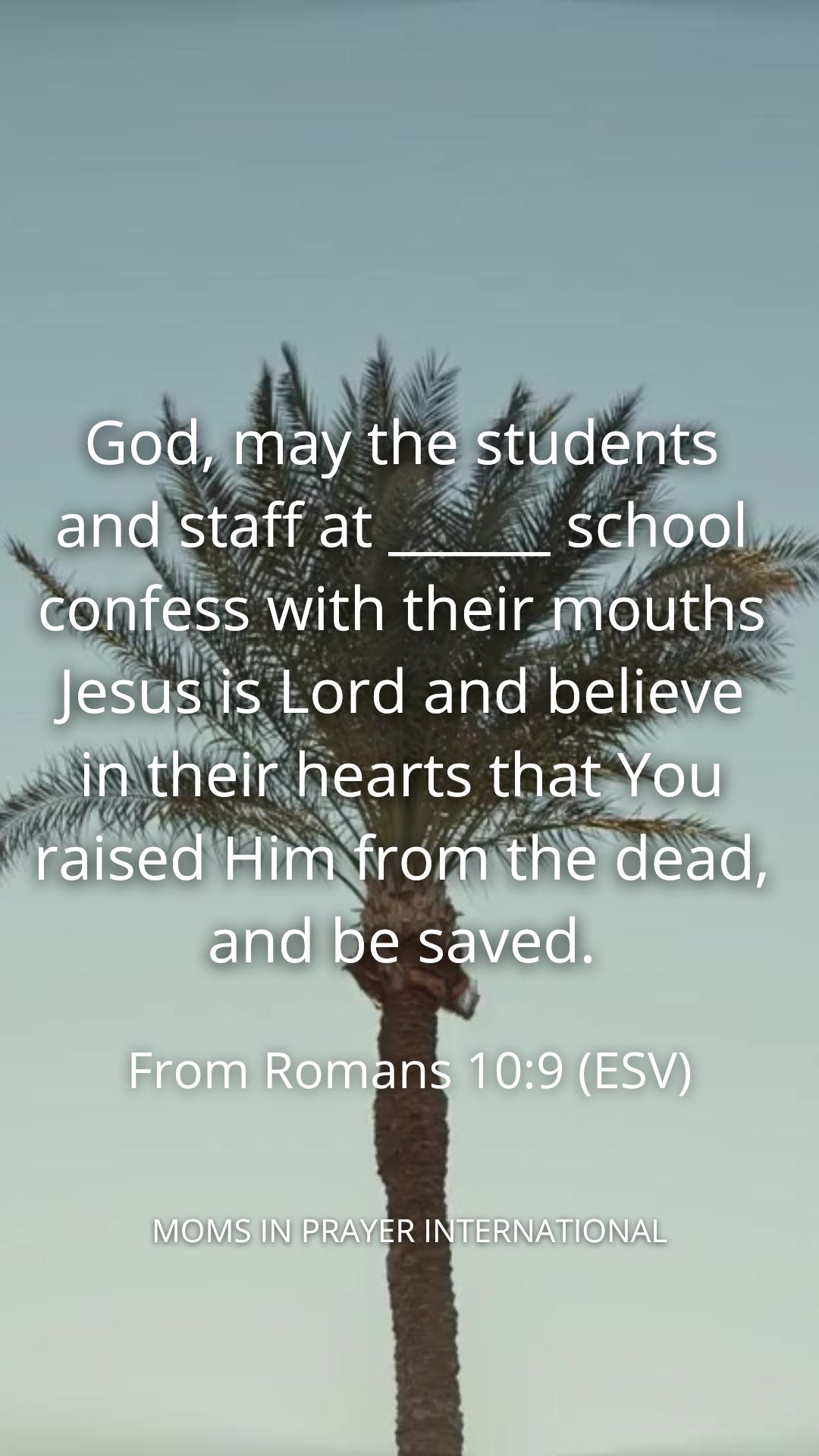 親愛的天父,但願 ______ 學校的師生們口裡認耶穌為主,心裡信神叫祂從死裡復活,就必得救。 羅馬書 10:9 (ESV)