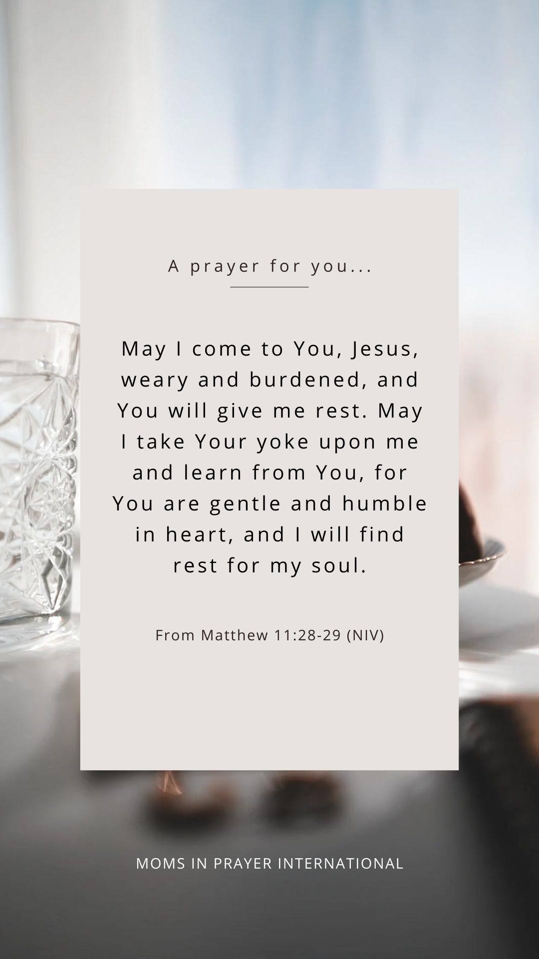 May I come to You, Jesus, weary and burdened, and You will give me rest. May I take Your yoke upon me and learn from You, for You are gentle and humble in heart, and I will find rest for my soul. From Matthew 11:28-29 (NIV)