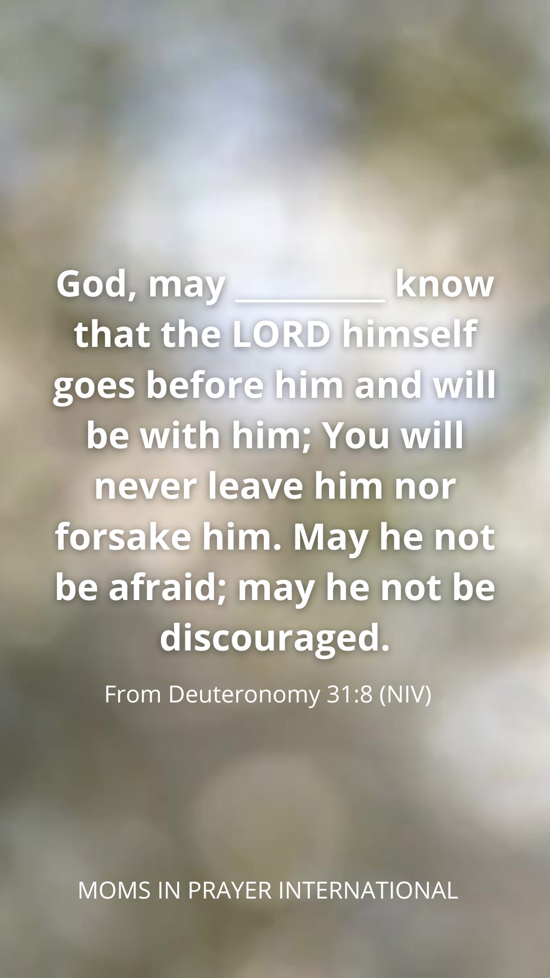 God, may _____ know that the LORD himself goes before him and will be with him; You will never leave him nor forsake him. May he not be afraid; may he not be discouraged. From Deuteronomy 31:8 (NIV)
