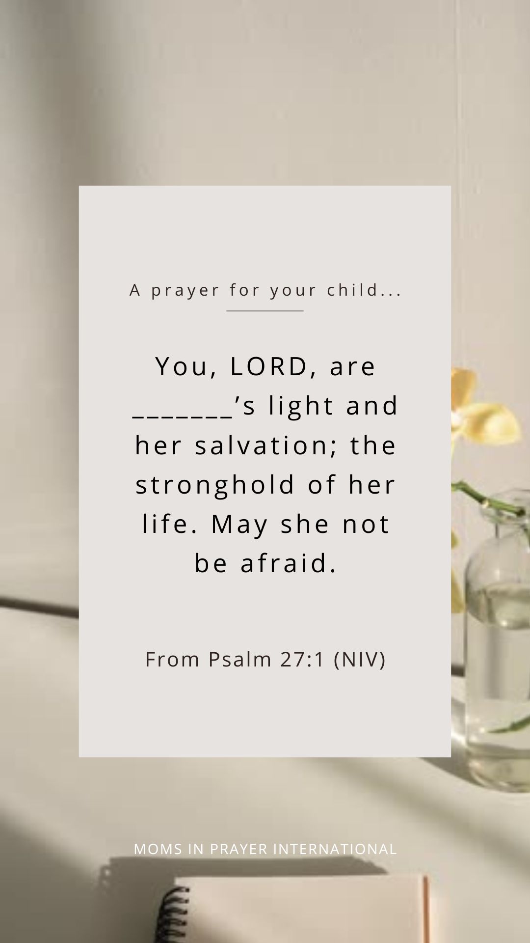 You, LORD, are _______’s light and her salvation; the stronghold of her life. May she not be afraid.