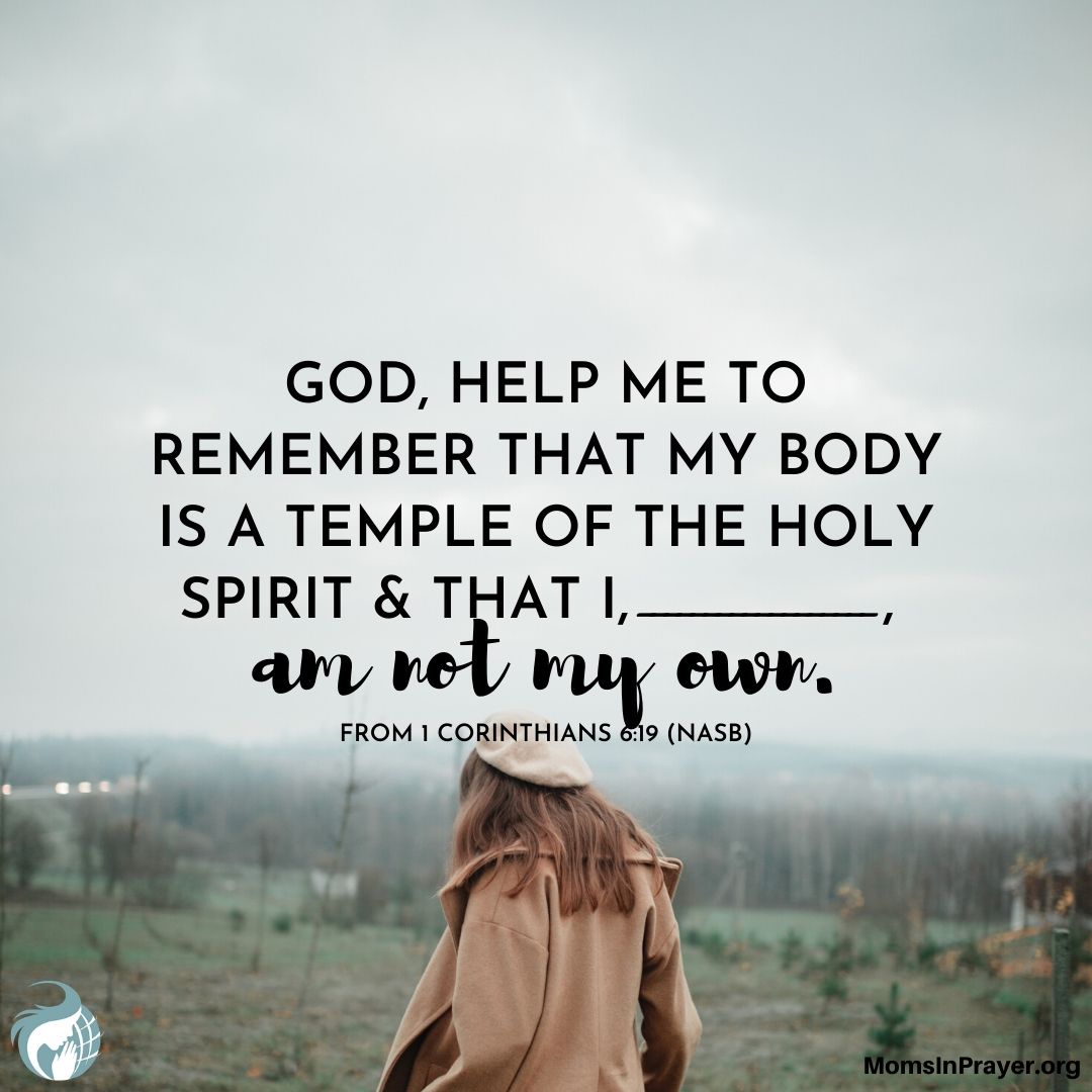 神啊!幫助我_____記住我的身體就是聖靈的殿;聖靈是祢所賞賜的,就住在我裡面。因此,我並不屬於我自己,我是屬神的兒女。