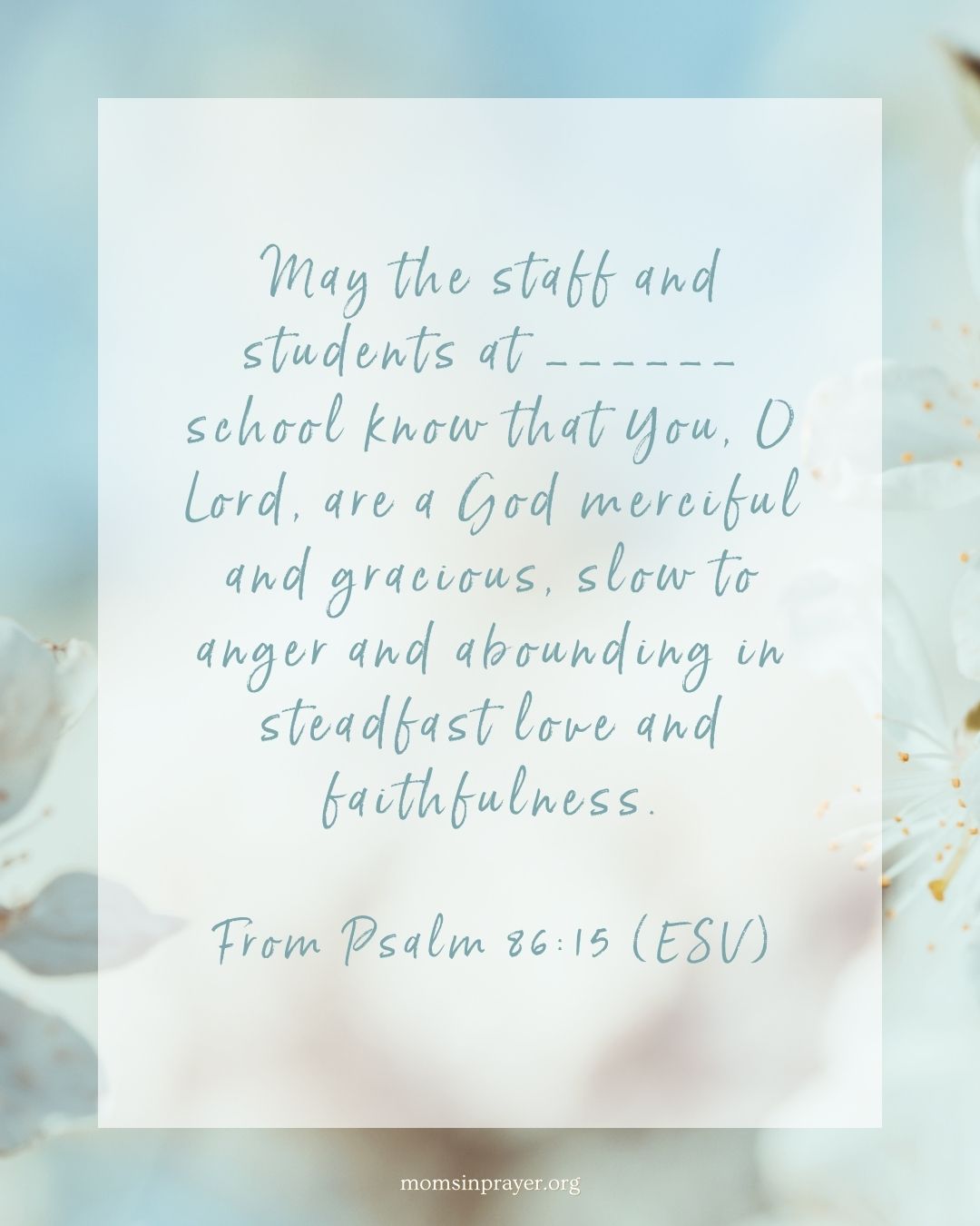May the staff and students at ______ school know that You, O Lord, are a God merciful and gracious, slow to anger and abounding in steadfast love and faithfulness. From Psalm 86:15 (ESV)