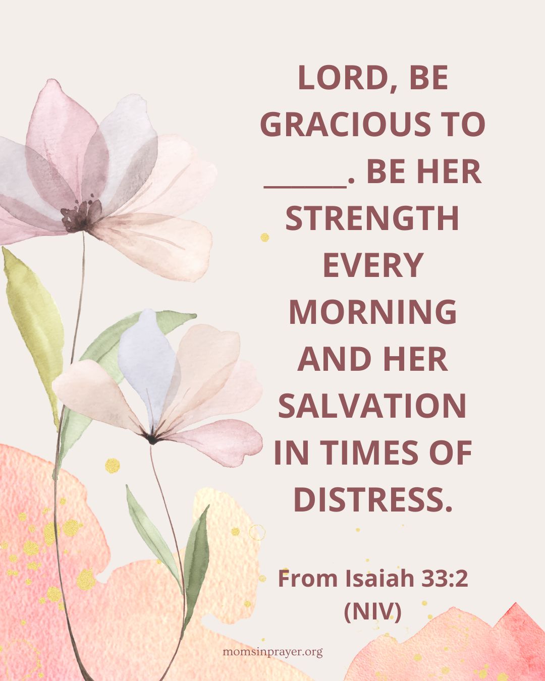 LORD, be gracious to ______. Be her strength every morning and her salvation in times of distress.