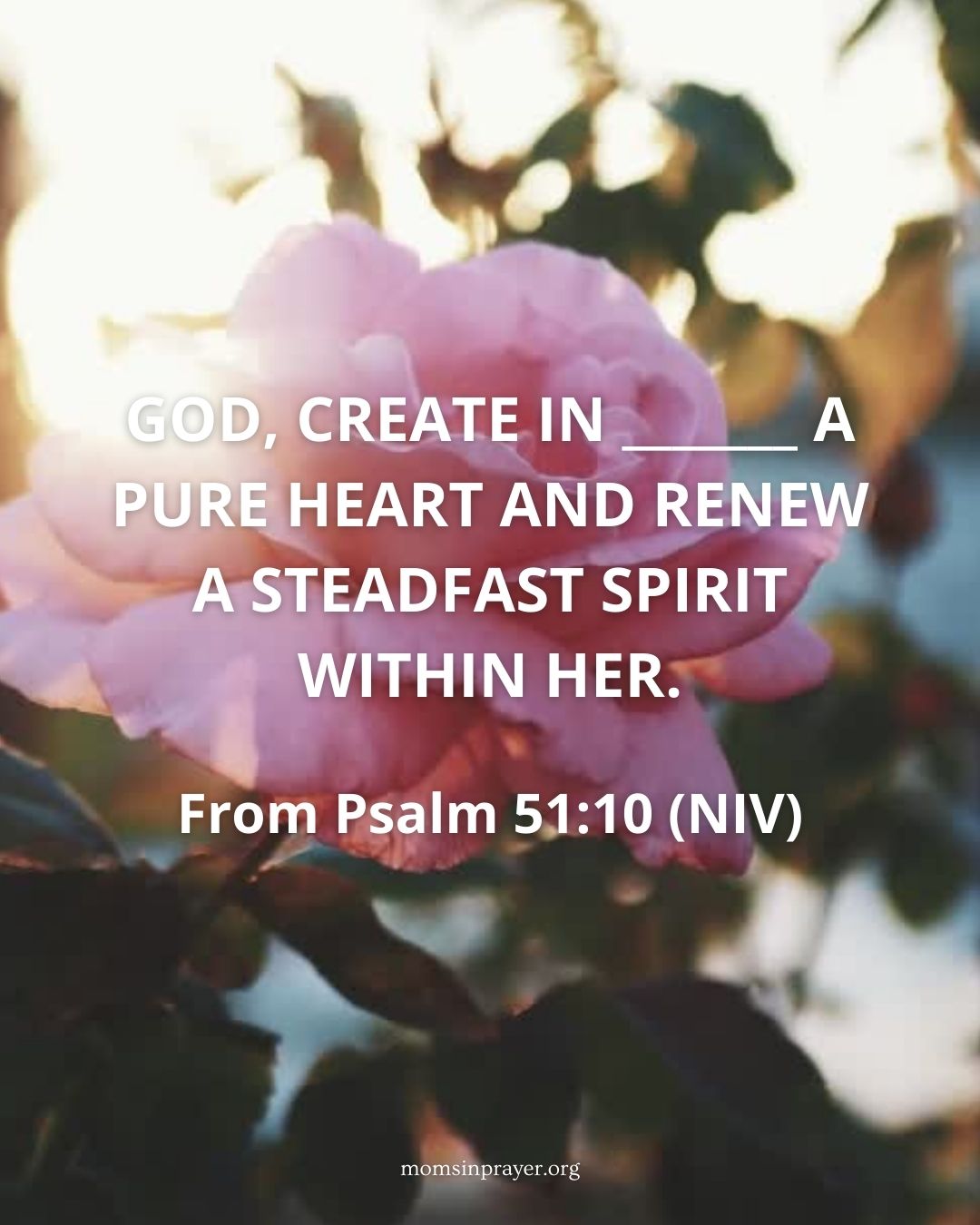 God, create in _______ a pure heart and renew a steadfast spirit within her.