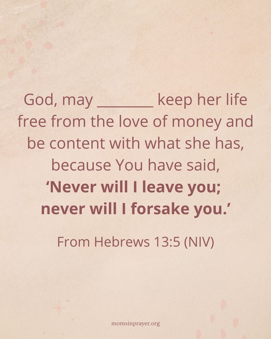 God, may ________ keep her life free from the love of money and be content with what she has, because You have said, ‘Never will I leave you; never will I forsake you.’ From Hebrews 13:5 (NIV)