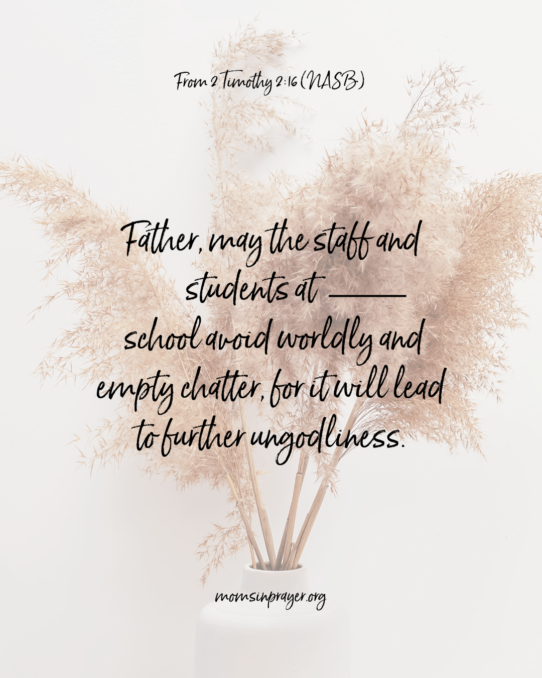 Father, may the staff and students at ______ school avoid worldly and empty chatter, for it will lead to further ungodliness.From 2 Timothy 2:16 (NASB)