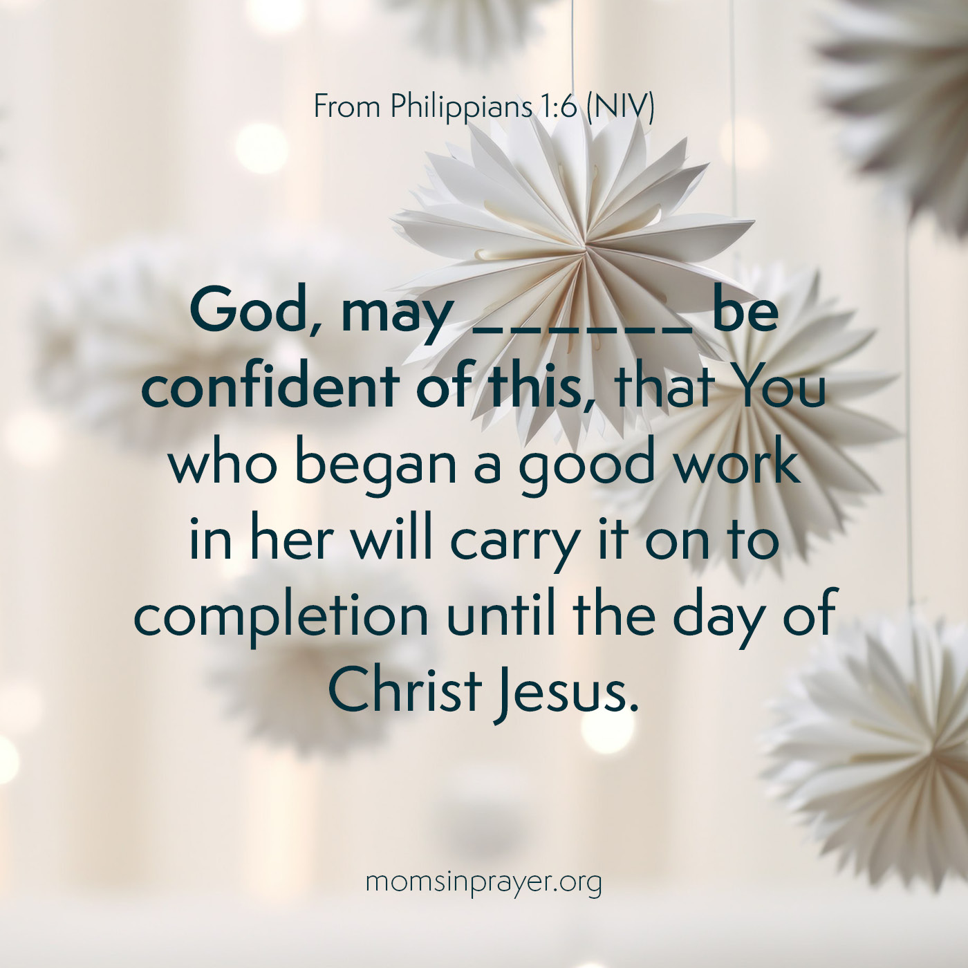 God, may _______ be confident of this, that You who began a good work in her will carry it on to completion until the day of Christ Jesus. From Philippians 1:6 (NIV)