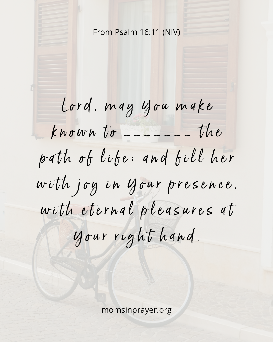 LORD, may You make known to ________ the path of life; and fill her with joy in Your presence, with eternal pleasures at Your right hand. From Psalm 16:11 (NIV)