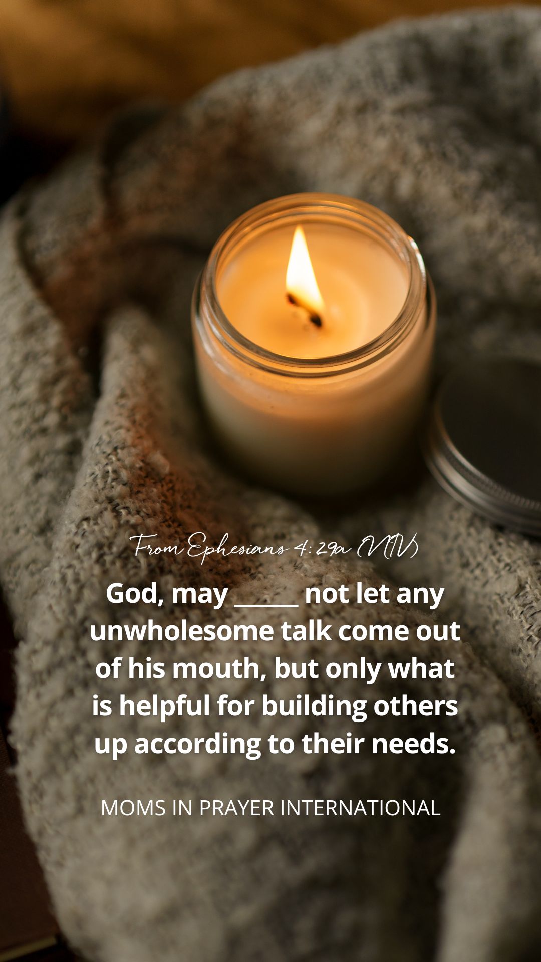 God, may ______ not let any unwholesome talk come out of his mouth, but only what is helpful for building others up according to their needs. From Ephesians 4:29a (NIV)
